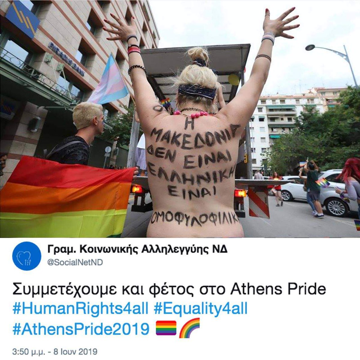 O εκπρόσωπος της ΝΔ, Γιώργος Σταμάτης ( προσωπική επιλογή του Κυριάκου Μητσοτάκη), έδωσε χαρούμενος το παρόν στην εκδήλωση που είχε αυτά ως συνθήματα...Φωτογραφία από το Gay pride της "Σαλονίκης"...