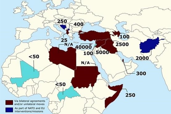 Στα κατεχόμενα της Κύπρου με 40.000 Τούρκους στρατιώτες, το Κατάρ, Σουδάν, τη Συρία, Ιράκ, Αφγανιστάν, Λιβύη, Κόσσοβο, Αλβανία, Βοσνία Ερζεγοβίνη , Αζερμπαϊτζάν , Λίβανος, Μάλι, Κεντροαφρικανική Δημοκρατία, Σομαλία κλπ.