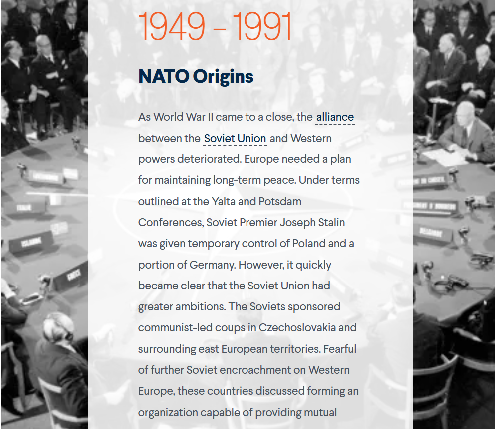 Μετά το τέλος του Β’ Παγκοσμίου Πολέμου, η σχέση μεταξύ της Σοβιετικής Ένωσης και των άλλων Συμμαχικών δυνάμεων επιδεινώθηκε. Ως αποτέλεσμα, οι Ηνωμένες Πολιτείες, ο Καναδάς και μια ομάδα δέκα ευρωπαϊκών χωρών οργανώθηκαν για μια νέα γεωπολιτική πραγματικότητα. Το 1949, δημιούργησαν τον Οργανισμό του Βορειοατλαντικού Συμφώνου (NATO), μια συμμαχία για τη διατήρηση μιας ελεύθερης, ολοκληρωμένης και δημοκρατικής Ευρώπης. Το NATO ιδρύθηκε ιδιαίτερα για να αντιμετωπίσει την αυξανόμενη επιρροή της Σοβιετικής Ένωσης.