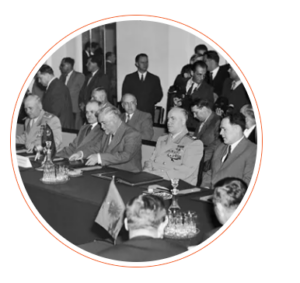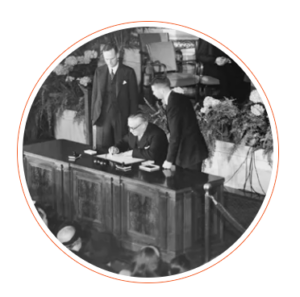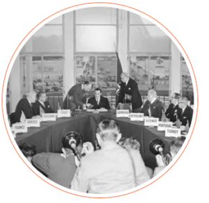 Οι υπουργοί Εξωτερικών των χωρών του ΝΑΤΟ παρακολουθούν καθώς ο Πιερ Μαντές-Φρανς, υπουργός Εξωτερικών της Γαλλίας, υπογράφει τις συνθήκες που καθιστούν τη Δυτική Γερμανία μέλος του ΝΑΤΟ, στις 22 Οκτωβρίου 1954. Bettmann via Getty Images