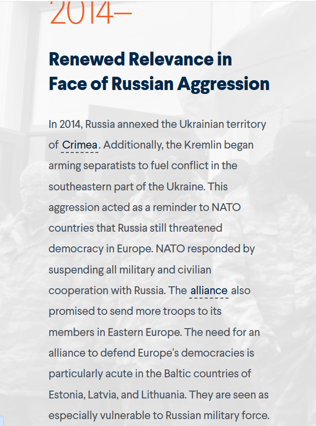 Το 2014, η Ρωσία προσάρτησε την ουκρανική χερσόνησο της Κριμαίας. Παράλληλα, το Κρεμλίνο άρχισε να εξοπλίζει αυτονομιστικές δυνάμεις, πυροδοτώντας τη σύγκρουση στο νοτιοανατολικό τμήμα της Ουκρανίας. Η επιθετική αυτή πολιτική λειτούργησε ως υπενθύμιση για τις χώρες του ΝΑΤΟ ότι η Ρωσία εξακολουθεί να συνιστά απειλή για τη δημοκρατία στην Ευρώπη. Σε απάντηση, το ΝΑΤΟ ανέστειλε κάθε στρατιωτική και πολιτική συνεργασία με τη Ρωσία. Η Συμμαχία δεσμεύθηκε επίσης να ενισχύσει στρατιωτικά τα κράτη-μέλη της στην Ανατολική Ευρώπη, με την αποστολή επιπλέον δυνάμεων. Η ανάγκη ύπαρξης μιας συμμαχίας για την υπεράσπιση των ευρωπαϊκών δημοκρατιών είναι ιδιαίτερα επιτακτική στις χώρες της Βαλτικής —την Εσθονία, τη Λετονία και τη Λιθουανία— οι οποίες θεωρούνται ιδιαιτέρως ευάλωτες στη ρωσική στρατιωτική ισχύ.